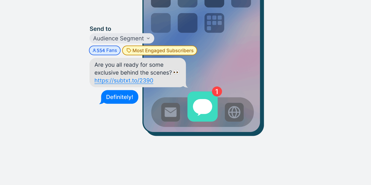Want to see what a fan engagement SMS program looks like in practice? Book a demo and we’ll walk through how teams use Subtext for two-way engagement, audience growth, segmentation, and direct fan communication.